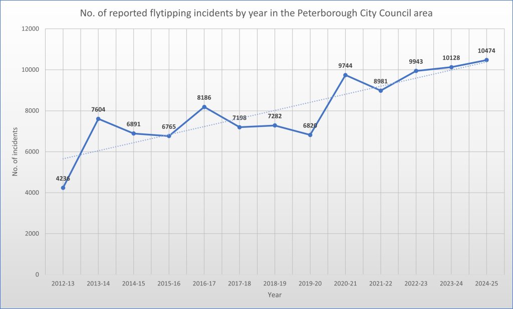 The chart below (updated with 2024-25 figures) shows that fly-tipping incidents across Peterborough have doubled over the past decade. It’s no surprise that residents are increasingly frustrated by the volume of waste on our streets, and the trend continues to rise. When combined with growing levels of litter and graffiti, it paints a worrying picture of a community in decline.